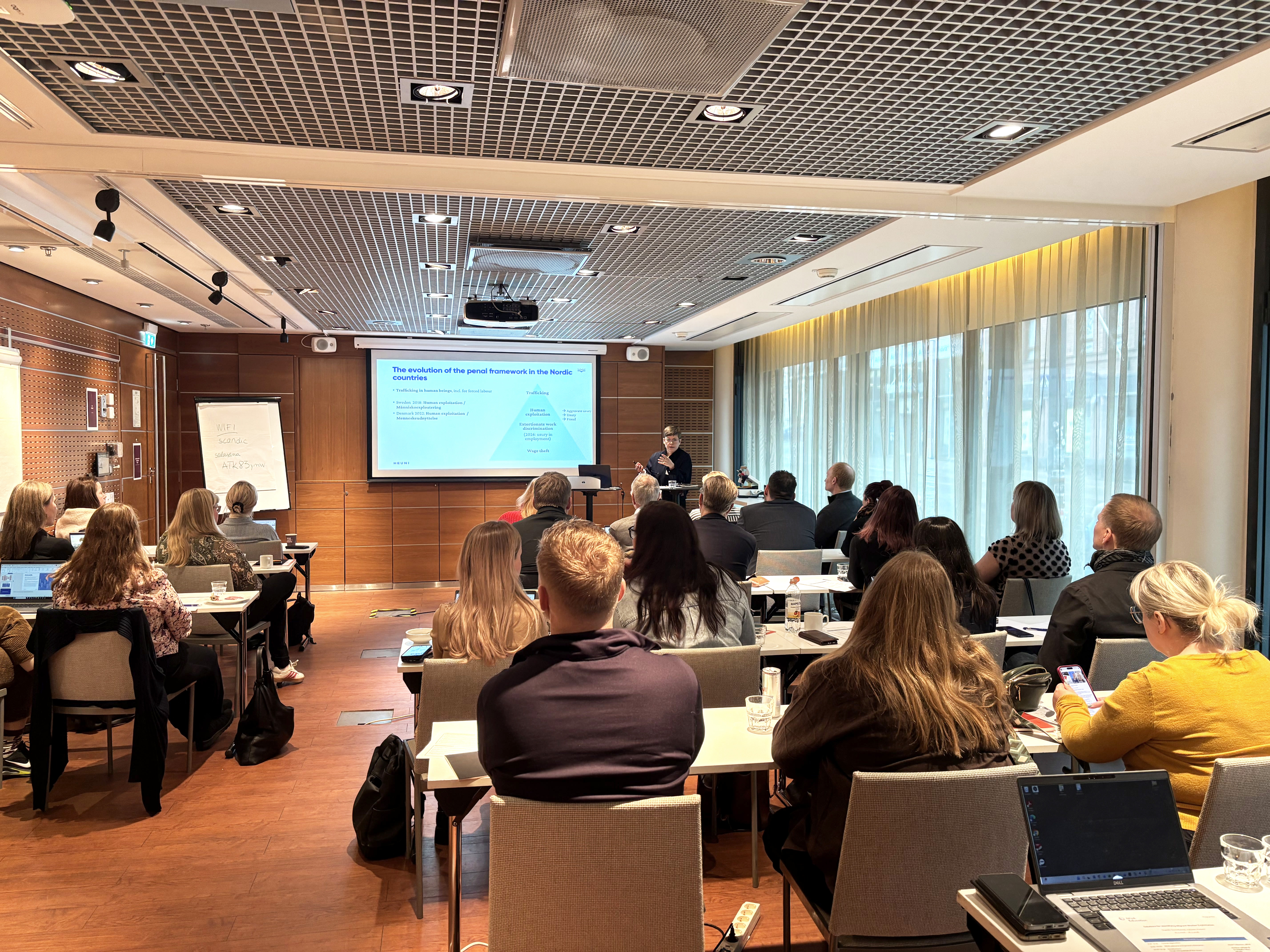 The programme featured contributions from HEUNI experts Natalia Ollus, Anniina Jokinen and Julia Korkman, alongside distinguished speakers including Thomas Laigaard (Danish Centre against Human Trafficking), Katja-Pia Jenu (Finnish Labour Inspectorate), Jussi Sakari (Finnish Construction Trade Union), Saga Kjartansdóttir (Icelandic Confederation of Labour ASÍ), Daniel Åman (Räddningsmissionen, Sweden) and Katarina Iskala-Blomster (Victim Support Finland).
